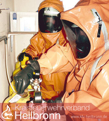 Rettende Spezialanzüge Innerhalb kürzester Zeit sind acht Einsatzfahrzeuge am Lauffener Freibad eingetroffen, etwa 50 Einsatzkräfte schwirren durch die Gegend, doch es herrscht keine Hektik. Jeder aus dem Team weiß genau, was er zu tun hat. Da wird der Gerätewagen Messtechnik, ausgerüstet für derartige Notfälle, in Stellung gebracht, Löschfahrzeuge beziehen Position, um mit einem Nebelvorhang die Ausbreitung des giftigen Gases zu verhindern, die Windrichtung wird festgestellt, eine Wasserleitung zum Neckar hergestellt während die Feuerwehrleute ihre notwendigen Spezialanzüge anlegen. „CSA“ wird der „chemische Schutzanzug“, genannt, in den sich die Feuerwehrleute zwängen müssen. Schon das Anlegen eines solchen Anzugs ist eine Kunst für sich. „Eigenschutz geht aber immer vor. Chlorgas wird über die Atmung, aber auch über die Haut aufgenommen“, erklärt Kenngott. Um wirksam retten zu können, müssen die Helfer selbst gesichert sein.