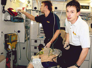Bild 1: Übungszenario im Lauffener Freibad: In komplett abgedichteten Schutzanzügen für den chemischen Einsatz verhindern die Feuerwehrleute die weitere Ausbreitung des giftigen Gases.Bild 2: Das Opfer wird im Rettungswagen nach dem Chlorgasunfall notärztlich von den Männern des Arbeiter-Samariter-Bundes versorgt.