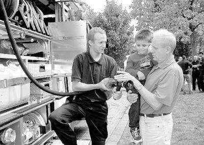 Doch Langeweile kam trotzdem nicht auf. Denn kurzerhand hatte sich die Jugendfeuerwehr ein paar Spiele für die kleinen Gäste ausgedacht. Da gab es unter anderem das Kegeln mit dem Feuerwehrschlauch, Ringewerfen oder das Löschen des Brandhauses mit Wasser aus der Kübelspritze. Große Augen machte auch der dreijährige Robin Gligorov aus Heilbronn. Er nahm zusammen mit seinem Opa, Dieter Steeb, das große Feuerwehrauto, ein LF 16/12 unter