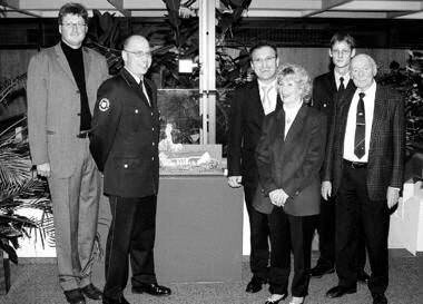Als Hintergrund dient der Salinen-Brand aus dem Jahr 1981, den Künstler Andreas Hammel als Malerei an der Fassade des Feuerwehrmagazins verewigt hat. Vor dieser Kulisse sind moderne Miniatur-Einsatzfahrzeuge zu sehen - auch eine Drehleiter, die die Offenauer allerdings nicht in ihrem Fuhrpark haben. Aber: Dieses moderne technische Gerät darf natürlich bei der Dokumentation über die Geschichte des Feuerwehrwesens (siehe Landkreis) nicht fehlen.