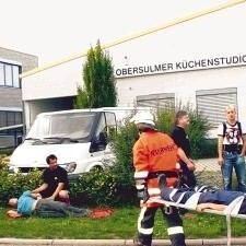 Auf einem Grünstreifen in der Dimbacher Straße haben 15 Orsy-mobil-Mitarbeiter als Ersthelfer eine Auffangstation für „Verletzte" eingerichtet. Diana Heere und ihre Kollegen versorgen die Leute, die Atemschutzträger aus dem Gebäude bergen, legen Kopfverbände an, schienen Beine und bringen die Geretteten in die stabile Seitenlage.