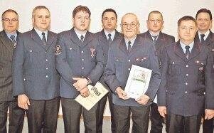 Bild: Bürgermeister-Stellvertreter Eckhard Keller (links) und Bezirksbrandmeister Frieder Lieb (von rechts) ehrten mit Kommandant Bauer die Wehrmänner.Foto: Stuber