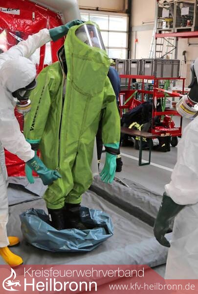 „Wir kommen immer dann zum Einsatz, wenn gefährliche Stoffe austreten“, erzählte Conrad Wagenbach von der Freiwilligen Feuerwehr Bad Rappenau. Die gefährlichen Stoffe können sowohl eine größere Menge Kraftstoff, als auch Chemikalien wie Chlor in den Schwimmbädern, Ammoniak für Kühlanlagen oder Brom an Schulen sein. „Wir wurden in Bad Friedrichshall zu einem Einsatz gerufen, nachdem an einer Schule festgestellt worden ist, dass im Chemieraum ein Behältnis beschädigt war“, so Wagenbach, der zum Führungsstab gehört. Ein weiteres Einsatzgebiet: Unfälle mit Gefahrguttransporten auf der Straße. So wie beim jüngsten Einsatz des 50 Mann umfassenden Gefahrstoffzuges. „Bei einer Verkehrskontrolle stellte die Polizei fest, dass bei einem Lastwagen aus dem Tank eine Flüssigkeit ausläuft. Wir wurden gerufen, um das Leck abzudichten, denn unsere Aufgabe als Feuerwehr vor Ort ist es, die eine Ausbreitung zu stoppen“, so Wagenbach. Auf drei bis vier Einsätze pro Jahr kommt die Sondereinheit, die sich alle zwei Monate zu einem Übungsdienst trifft. „Bei einem Einsatz rücken wir mit einem Rüstwagen, einem Löschfahrzeug, dem Gerätewagen Gefahrgut sowie einem Führungsfahrzeug aus. Insgesamt sind das 17 Mann“, so Wagenbach. Den Dienst beim Gefahrstoffzug leisten die Floriansjünger zusätzlich zu ihrem eigentlichen Feuerwehrdienst. „Mitglied dieser Sondereinheit kann nur werden, wer Atemschutzgeräteträger ist. Zur Ausbildung gehört ein Lehrgang für den ABC-Einsatz an der Landesfeuerwehrschule in Bruchsal.“