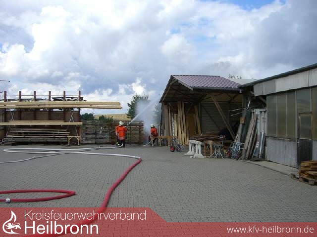 Hierzu wurde ein Brand auf dem Gelände eines Zimmereibetriebs am äußersten Ende des Gewerbegebiets als Übungslage zu Grunde gelegt. Bei dem angenommenen Großbrand, bei dem auch zwei Personen aus einem Keller zu retten waren, galt es den angenommenen Brand zu löschen und die angrenzenden Gebäude auf Nachbargrundstücken zu schützen.