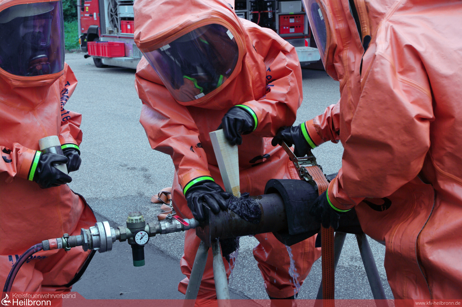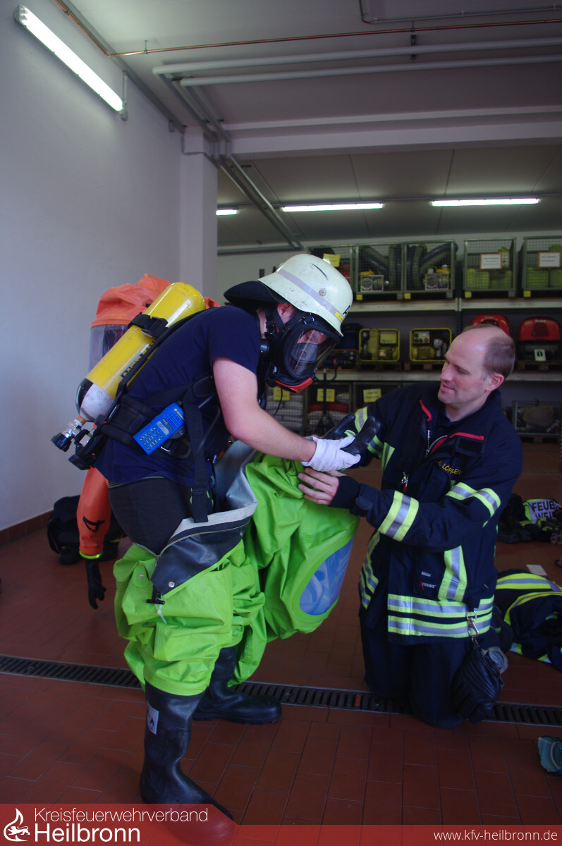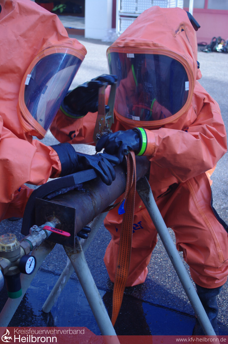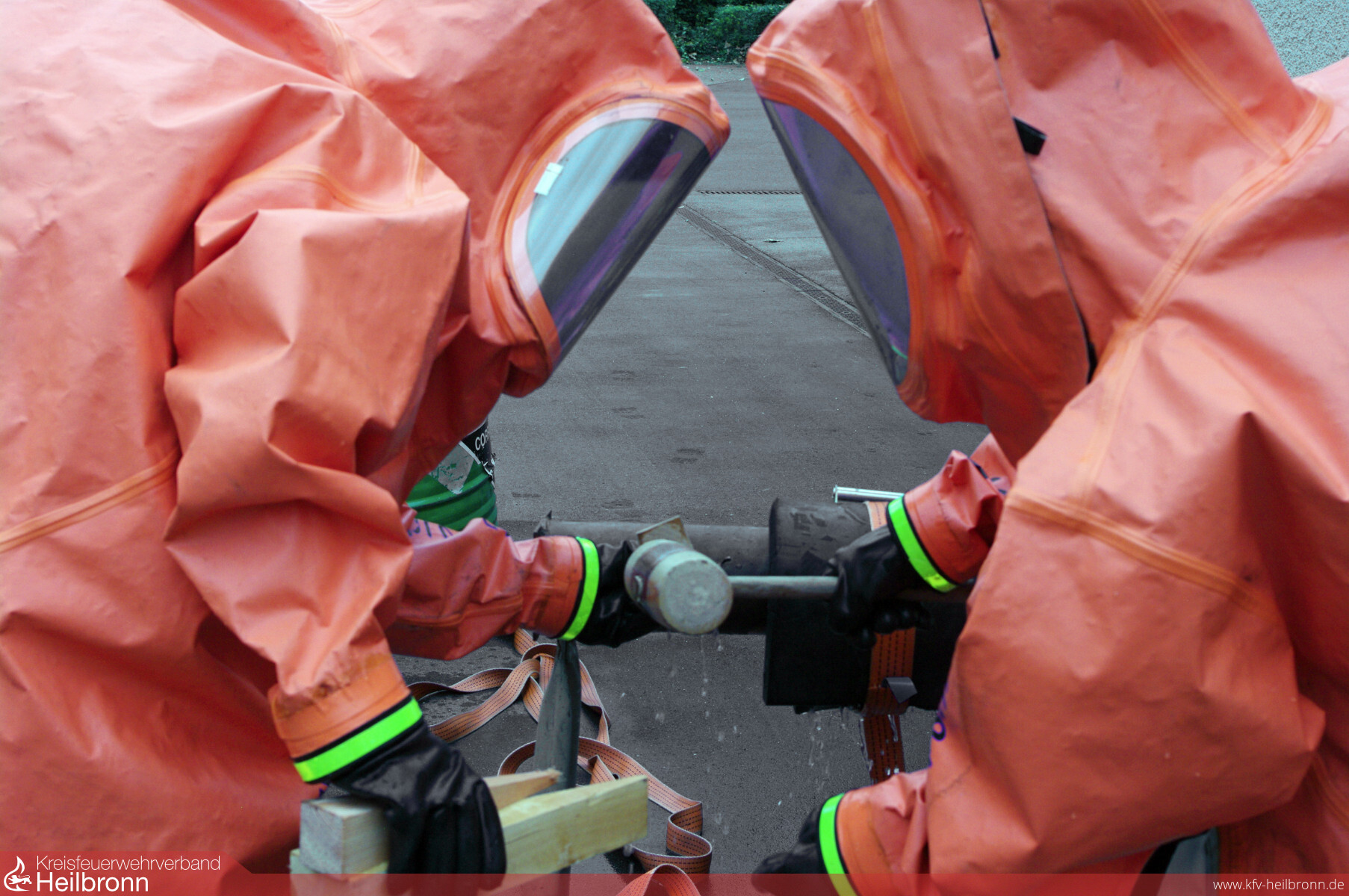 Neben dem Anlegen wurde auch die Arbeit mit Chemiekalienschutzanzügen geübt. Leckagen in Fässern und Leitungen mussten mit dem Material der in Bad Rappenau und Weinsberg stationierten Gerätewagen Gefahrgut so gut wie möglich abgedichtet werden. Zusätzlich musste zur Gewöhnung an die Ausrüstung ein kleiner Parcour quer über das Feuerwehrgelände im Chemiekalienschutzanzug abgelaufen werden.