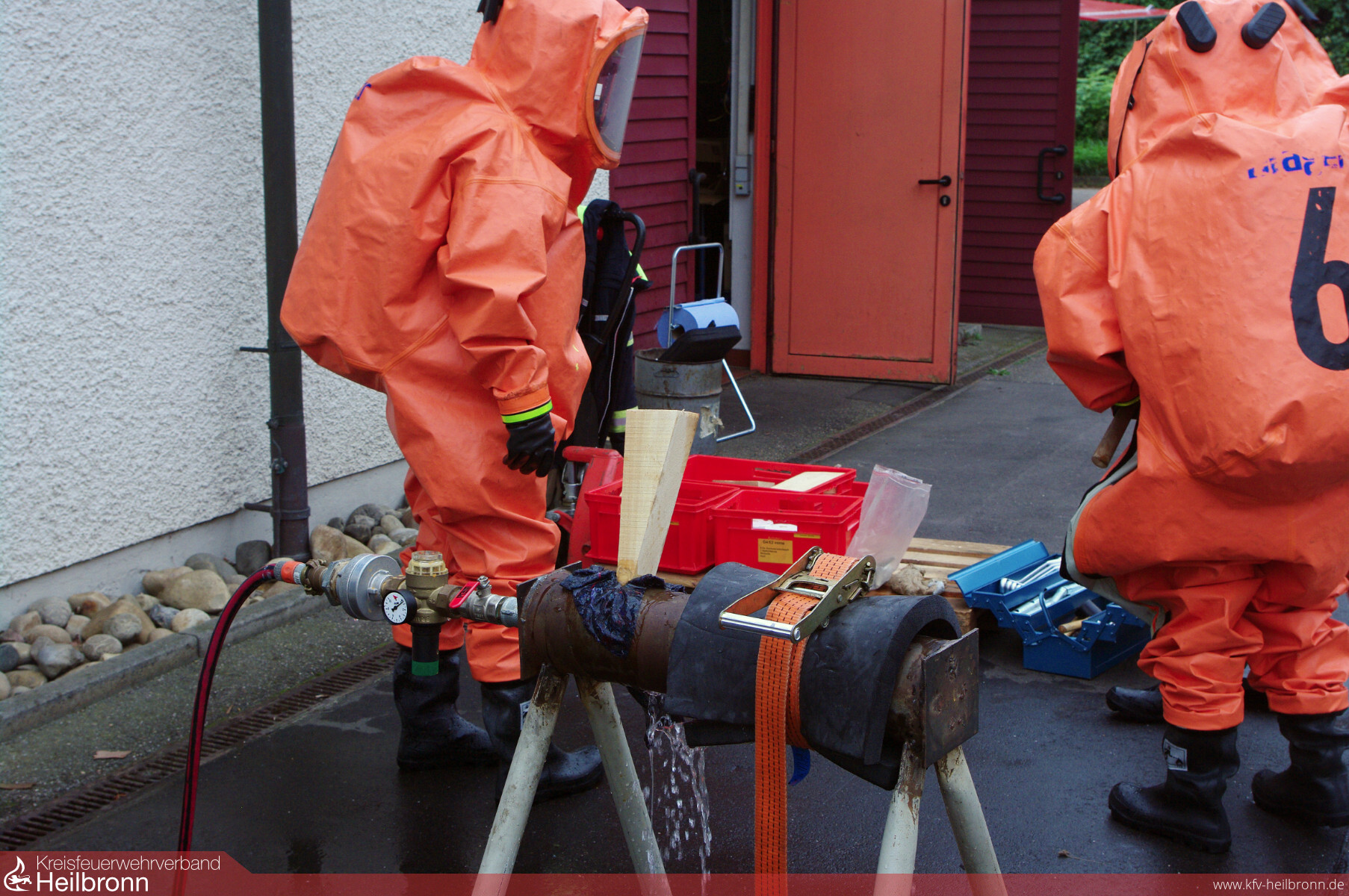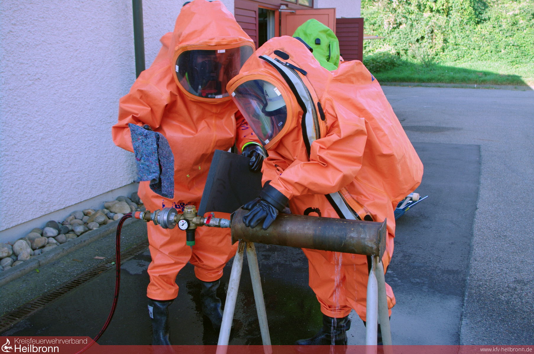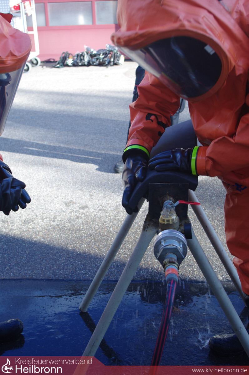 Neben dem Anlegen wurde auch die Arbeit mit Chemiekalienschutzanzügen geübt. Leckagen in Fässern und Leitungen mussten mit dem Material der in Bad Rappenau und Weinsberg stationierten Gerätewagen Gefahrgut so gut wie möglich abgedichtet werden. Zusätzlich musste zur Gewöhnung an die Ausrüstung ein kleiner Parcour quer über das Feuerwehrgelände im Chemiekalienschutzanzug abgelaufen werden.