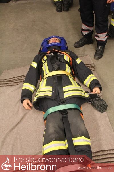 An der Drehleiter zeigte sich, dass es verschiedene Arten von Krankentragen gibt, die auch an der Krankentragehalterung am Korb unterschiedlich zu sichern sind. Mit einem rund 80 Kg schweren Dummy wurde dann das Vorgehen mit dem Trageteil der Krankenfahrtrage aus dem RTW, der Schleifkorbtrage aus dem Rüstwagen und einer Krankenklapptrage praktisch geübt.