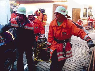 Die Menschenrettung hatte Priorität. Während vom Tanklöschfahrzeug die Schlauchleitungen aufgebaut wurden, legten Alexander Kawa und fünf weitere Kameraden ihre Atemschutzgeräte an. Die drei Atemschutztrupps hatten in der ersten Phase die schwierige Aufgabe, zu dem vermeintlich Verletzten vorzudringen. Dieter Betzelberger hatte die wichtige Funktion, die Atemschutztrupps zu überwachen. Auf einer gelben Schreibklatte vermerkte er genau die Zeiten unter der Atemmaske und sorgte rechtzeitig für Ablösung.