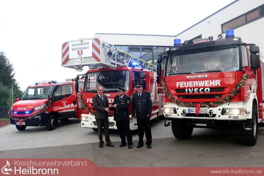 Die Kameraden der Feuerwehr Wüstenrot konnten gleich drei neue Fahrzeuge übernehmen. Bereits im Februar wurde das erste Fahrzeug des Trios, ein HLF 20 der Firma Magirus Brandschutztechnik geliefert. Das Hilfeleistungslöschfahrzeug ist auf einem Singlebereiften Allradfahrgestell der Fa. Iveco aufgebaut. Die Kosten für dieses Fahrzeug belaufen sich auf ca. 390000 Euro.