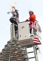 Vorsichtig manövriert Ernst Dorsch von der Freiwilligen Feuerwehr Obersulm in luftigen 18 Metern Höhe den Korb der Drehleiter an die Turmspitze der kleinen evangelischen Kirche in Obersulm-Weiler. Mit an Bord sind Schmied Helmut Wieland und das neue geschmiedete Kreuz mit dem goldenen Wetterhahn.