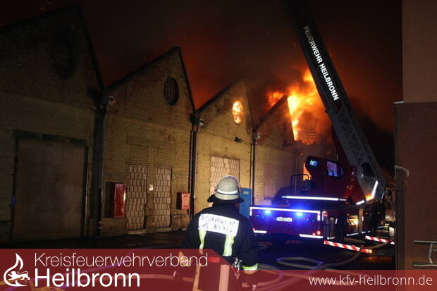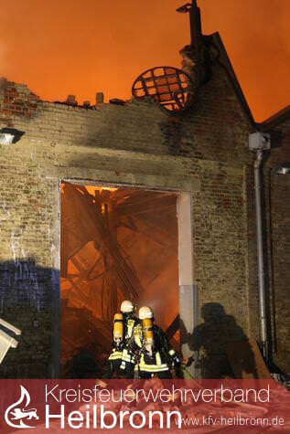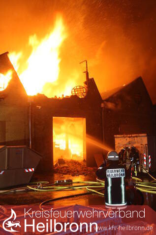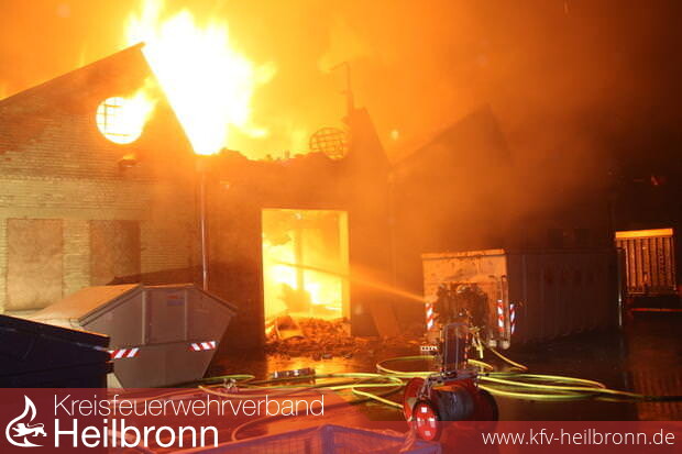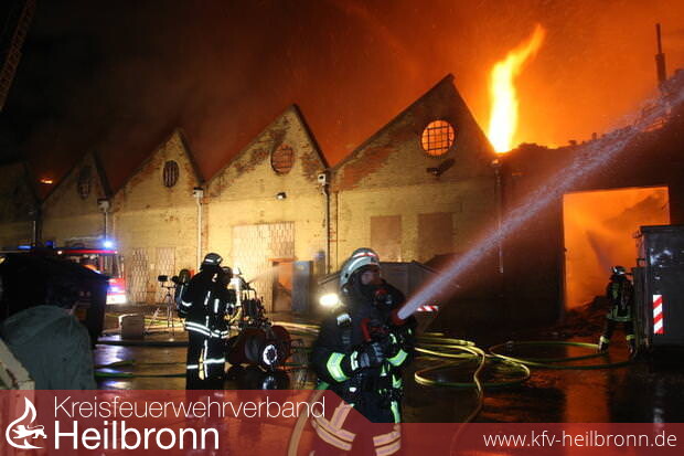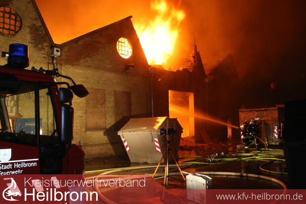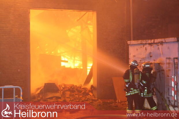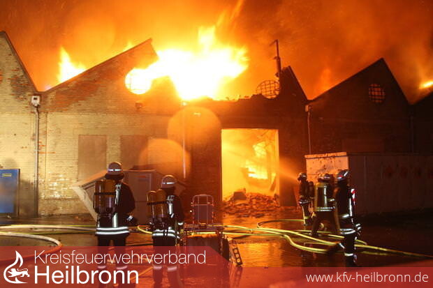 Nach zwei Stunden im Einsatz gab die Feuerwehr das Gebäude auf. Sie ließ die Lagerhalle im Heilbronner Industriegebiet in der Salzstraße „kontrolliert abbrennen“, wie Feuerwehr-Kommandant Eberhard Jochim sagte. 200 Feuerwehrleute mit 37 Fahrzeugen – unterstützt von 50 Polizeibeamten – waren um 21 Uhr nur noch damit beschäftigt zu verhindern, dass die Flammen auf Nebengebäude übergriffen, was offenbar gelang. Das Dach des 130 Meter langen Gebäudes stürzte ein. Einige Giebel der Backsteinwände auch. Die vorläufige Bilanz klingt verheerend: Fünf Millionen Euro Schaden. Die Halle ist nur noch Schutt und Asche.