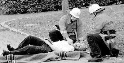 Trotz roter Schlieren im Gesicht und an den Händen war der junge Mann aus dem Rot-Kreuz-Team für realistische Unfalldarstellung wieder recht munter. Die Blutspuren waren gekonnt geschminkt. Das Schmerzgestöhne als Verletzter war überzeugend gespielt. Mehr ums Durst löschen ging es beim Feuerwehrfest am zweiten Tag. Die Einsatzfahrzeuge mussten den Besentischen weichen.