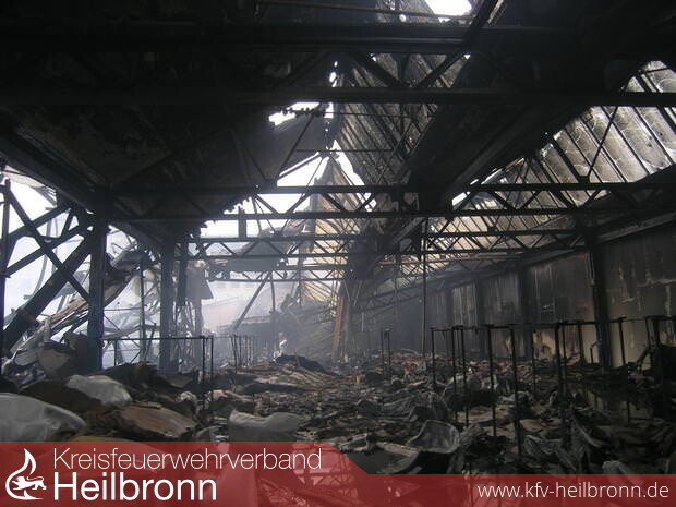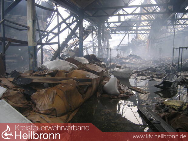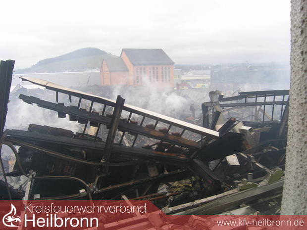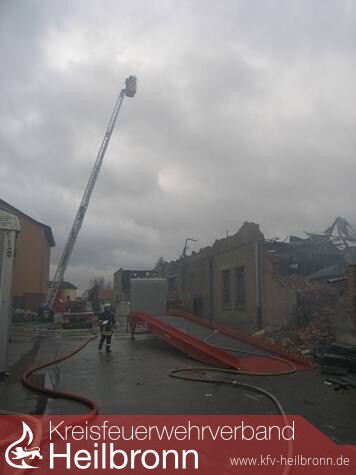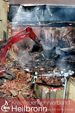 Noch am Vormittag war die Feuerwehr damit beschäftigt, kleinere Glutnester in der riesigen Trümmerhalde, die mal eine Lagerhalle war, zu löschen. Doch der Wind blies immer wieder auf das 80 mal 60 Meter große Areal an der Heilbronner Salzstraße und entfachte die Brandherde. Abbrucharbeiten mussten unterbrochen werden, weil die Brandsachverständigen sonst noch weniger Spuren auf die Ursache des Brandes finden würden.