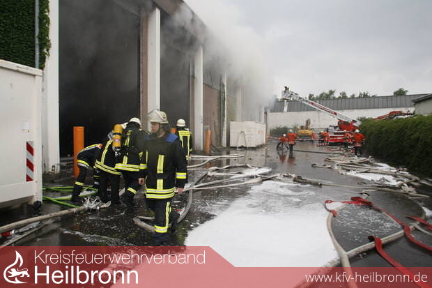 Um kurz nach 12 Uhr herrscht Chaos vor der Lagerhalle, ein stechender Geruch liegt in der Luft. „Da drin ist es schwarz wie die Nacht, man sieht keine zwei Zentimeter weit“, sagt Volker Lang, Pressesprecher der Feuerwehr Schwaigern. Über das Hallendach ragen Feuerwehrleitern, Männer mit Atemschutzgeräten löschen in den dicken Rauchschwaden. Unaufhörlich zieht der Rauch aus den geborstenen Fenstern – die Säule ragt etwa 500 Meter in den Himmel.Ein Baggerfahrer reißt Hallentore auseinander, damit die Feuerwehr besser löschen kann. Das Löschwasser überschwemmt den Platz. Etliche Leute sind zu Fuß aus dem Ort gekommen und stehen hinter den Absperrbändern, um das Geschehen zu verfolgen. „In einem solchen Ausmaß habe ich sowas noch nie erlebt“, sagt ein Anwohner. Einen Großbrand in dieser Dimension hat es im Landkreis lange nicht mehr gegeben.Schaden in MillionenhöheKreisbrandmeister Uwe Vogel spricht von einem Schaden in Millionenhöhe. 11.31 Uhr ist es, als die Feuerwehr über einen Brandmelder alarmiert wird. In den nächsten Stunden sind rund 160 Feuerwehrleute aus dem Landkreis Heilbronn mit Löscharbeiten beschäftigt, mit 40 Fahrzeugen rücken sie an. In der 1600 Quadratmeter großen und zehn Meter hohen Halle lagerten nach Auskunft von Peter Kurz, Inhaber des Recyclingbetriebs, gepresste Papier- und Kunststoffballen – zwischen 100 und 200 Tonnen.Rettungssanitäter und Notärzte rüsten sich aufgrund der außergewöhnlichen Situation mit speziellen Anti-Rauchgasmitteln aus. „Das sind rein vorbeugende Maßnahmen“, sagt Dr. Stefan Linke, leitender Notarzt, um kurz nach 14 Uhr. Im Extremfall könnte der giftige Rauch ein toxisches Lungenödem und damit Atemnot auslösen.„Die Brandbekämpfung zeigt jetzt Wirkung, der Rauch wird heller“, sagt Kreisbrandmeister Vogel, der am frühen Nachmittag im Hubschrauber über die Halle fliegt. Ein Vorteil sei jetzt der einsetzende Regen, sagt Volker Lang – dadurch verringere sich die Salzsäure-Konzentration in der Luft. Mit einer Turbine auf einem speziellen Fahrzeug blasen die Feuerwehrleute den Rauch vom Einsatzort weg. Am späten Nachmittag löst sich der Rauch auf, die Warnung wird aufgehoben.Inzwischen konnte auch das Feuer komplett gelöscht werden. Noch immer aber seien Feuerwehrleute mit Aufräumarbeiten beschäftigt, sagt Volker Lang, Pressesprecher der Feuerwehr Schwaigern.RauchgefährdungLaut Feuerwehr ist die Konzentration der Salzsäure im Rauch nicht gefährdend gewesen. Nur vor der Halle sei kurzzeitig die Maximale Arbeitsplatz-Konzentration erreicht gewesen. Das ist die maximal zulässige Konzentration ein Stoffes am Arbeitsplatz, bei der kein Gesundheitsschaden zu erwarten ist.