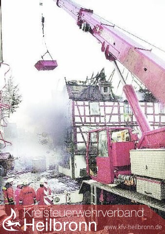 Die Fassade im Treppenhausbereich droht zu kippen. Mit dem 44-Tonnen-Kran der Berufsfeuerwehr Heilbronn werden Kamin und Giebel des dreistöckigen Hauses abgetragen. Atemschutzträger stützen die Decken ab. Die Ehrenamtlichen riskieren viel. Der Statiker Thomas Schwarzer hat ständig die Standsicherheit des Baus im Auge.
