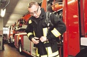 Bild: Matthias Köhl, der alle technischen Ausbildungen hat, zeigt im Feuerwehrhaus in Weinsberg, wie man ein Atemschutzgerät anlegt. (Foto: Guido Sawatzki)