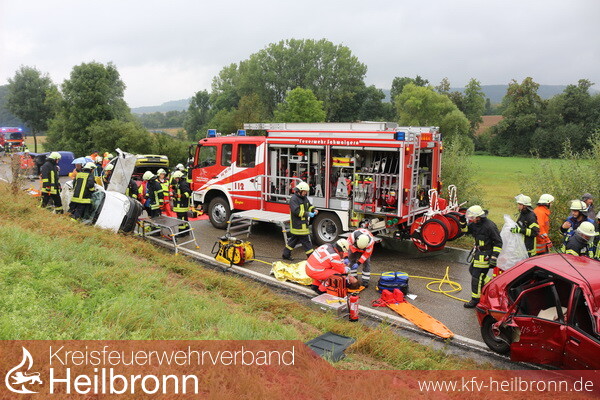 Etliche Verkehrsteilnehmer wundern sich am Sonntagmorgen über die Sperrung der Kreisstraße 2048 zwischen Leingarten und Massenbach. Doch in 400 Meter Entfernung von der B-293-Kreuzung hat die Wehr ein Szenario aufgebaut, wie es in der Realität kaum schrecklicher sein kann: einen Verkehrsunfall, in den zehn Pkw, ein Linienbus und ein Silozug verwickelt sind.