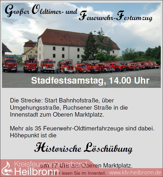 Geplant ist hierbei ein großer Festumzug durch Möckmühl und im Anschluss, gegen 17 Uhr, eine historische Löschübung am Oberen Marktplatz. Am Umzug werden 35 Feuerwehroldtimerfahrzeuge, mehrere historische Schlepper mit Anhängeleitern und viele handgezogene Fahrzeuge teilnehmen. Weiterhin haben sich 18 Feuerwehren, z. T. mit Fahnen und weitere Accessoires sowie einige Vereine angemeldet.