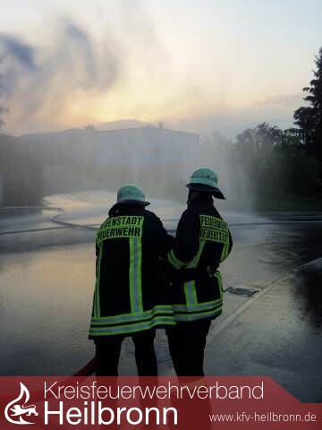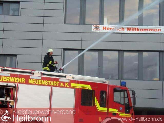 In der Nähe zur Autobahn ist in den vergangenen Jahren die Firma Albert Braun Neuenstadt weiter gewachsen. Nach der Fertigstellung des Anbaues bot sich für die Feuerwehr die Gelegenheit gemeinsam mit dem Roten Kreuz hier eine Großübung aller Abteilungen durchzuführen. Es wird ein Brandausbruch im Bereich der Verladerampe angenommen. Zwei Mitarbeiter werden bei Löschversuchen schwer verletzt, ein Lagerarbeiter ist auf einem Stapler in der Höhe eingeschlossen. Auch in den oberen Geschossen ist einigen Personen durch den tödlichen Brandrauch der Weg ins Freie versperrt. Die Feuerwehr Neuenstadt und der Rettungsdienst rücken an. Dann die Alarmmeldung Traktorbrand in Cleversulzbach, was zu einer Unterbrechung der Übung führte. Glücklicherweise konnte der Brand rasch unter Kontrolle gebracht werden. So konnte die Übung, leicht modifiziert eine dreiviertel Stunde später fortgesetzt werden. Die Abteilung Neuenstadt geht von der Verladerampe aus in das Gebäude vor und rettet die hier Eingeschlossenen. Stein / Kochertürn baut sich seine Wasserversorgung von der Öhringer Straße kommend auf und begibt sich zur Menschenrettung unter Atemschutz in die oberen Stockwerke des Verwaltungstraktes. Die Abteilung Cleversulzbach war unterdessen noch mit Nachlöscharbeiten des Traktorbrandes beschäftigt. Die Verletzten werden zur eingerichteten Verletztensammelstelle gebracht und vom Roten Kreuz mit versorgt. Nach Abschluss der Löscharbeiten zeigte sich Kommandant Schaffroth zufrieden mit der Leistung seiner Mannschaft. Inhaber und Enkel des Firmengründers Marcus Braun war beeindruckt von der Leistungsfähigkeit der Feuerwehr Neuenstadt. Die Feuerwehr Neuenstadt dankte der Familie Braun und ihren Mitarbeitern für die Möglichkeit an diesem Industriegebäude zu üben, nur so kann die Wehr sich auch auf zukünftige Herausforderungen einstellen und ihr Können und Wissen erweitern!