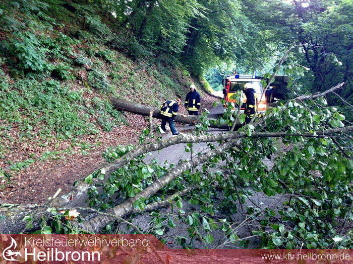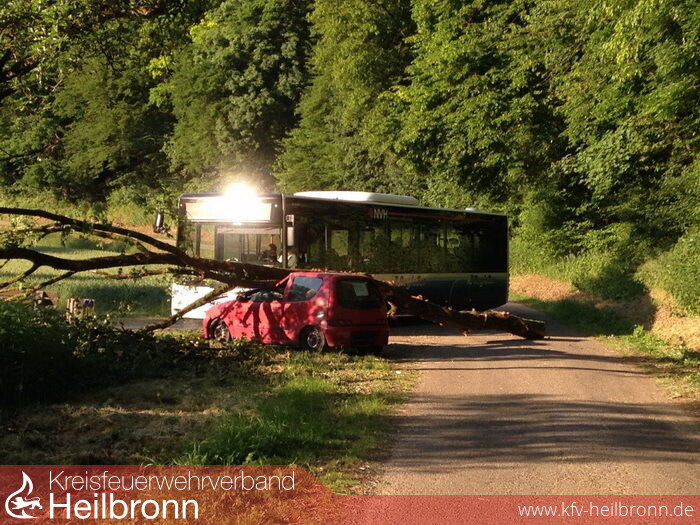 Ein Reisebus war mit einer Gruppe im OT Korb um dort den Abschluss eines Tagesausfluges zu begehen. Nachdem ein starkes Unwetter aufzog und im Hergstbachtal bereits wütete, entschloss sich der Busfahrer zur Weiterfahrt, hierbei verwechselte er die Straßen in Richtung Möckmühl und Ruchsen. Auf der engen Verbindungsstraße war ein Wendemanöver nicht mehr realisierbar.