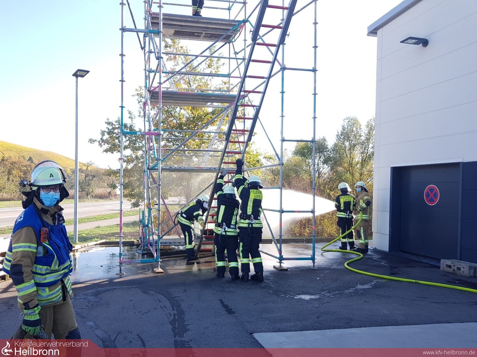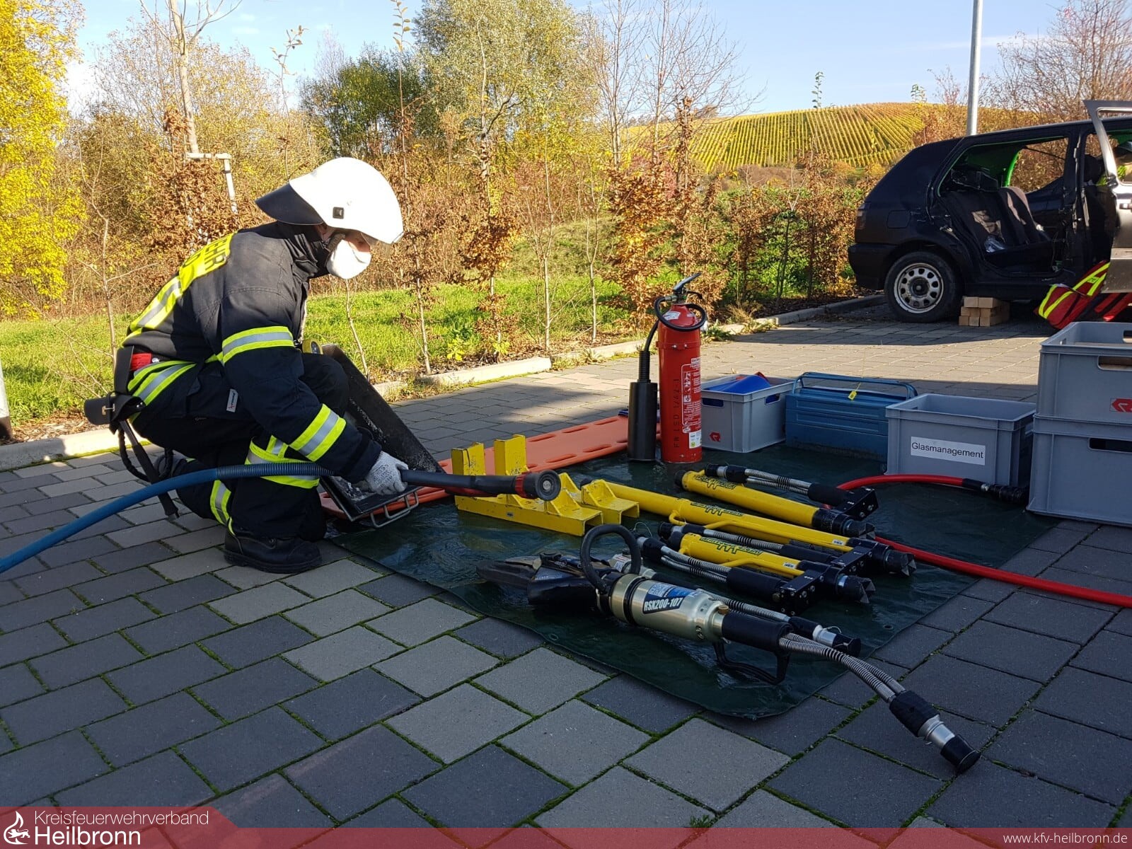 Start der Ausbildung war bereits im Frühjahr mit einer Onlineteilnahme an einem Webinar der Landesfeuerwehrschule Baden-Württemberg. Auf dieser Grundlage bauten die restliche Ausbildungseinheiten auf. Es folgten mehrere Theorieeinheiten im Feuerwehrhaus Ellbachtal. Kommandant Steffen Heber führte in Ilsfeld die Unterrichtseinheit Brennen und Löschen durch. Die Feuerwehr Obersulm und Lauffen unterstütze die Grundausbildung bei der Fahrzeugkunde mit Sonderfahrzeugen. Sehr gut waren die Voraussetzungen auf dem Gelände der Feuerwehr Ellbachtal für die Praktischen Inhalte: Hydrantenkunde, Wasserentnahme offenes Gewässer, Löschangriff in der Gruppe und Staffel, tragbare Leitern, Kleinlöschgeräte und Schaumrohr. An einem Übungs-PKW konnten die Grundtätigkeiten der technischen Hilfeleistung sofort praktisch umgesetzt werden. Auch die Themen Ausleuchten von Einsatzstellen, Verkehrsabsicherung, Löschwasserrückhaltung und Kleingeräte waren Bestandteil im Stundenplan.