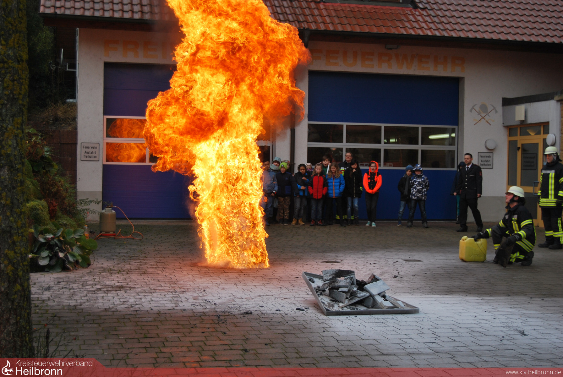 Als Höhepunkt und auch gleichzeitig als Abschluss wurde eine Fettexplosion demonstriert. Abteilungskommandant Dominik Glasbrenner erklärt nunmehr was jetzt im Einzelnen passieren wird. Erstaunt schauten sich die Schüler an wie sich der Feuerballon in den Massenbacher Himmel schraubte. Spätestes jetzt hatte jeder Verstanden warum man einen Fettbrand niemals mit Wasser löschen darf.