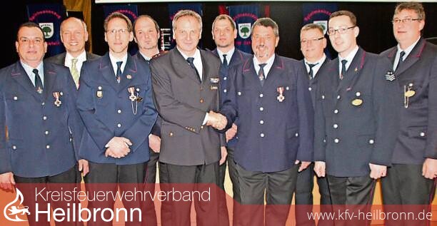 Reinhold Gall als Vorsitzender des Kreisfeuerwehrverbands Heilbronn zeigte sich beeindruckt, dass 40 Prozent der Mitglieder nach Fortbildungen befördert werden konnten. Walter Röhrich wurde für 40 Jahre Feuerwehrzugehörigkeit geehrt. Manfred Armbruster, Steffen Brod, Jürgen Maier, Steffen Mistele, Ulrich Röhrich und Matthias Sinn wurden für 25 Jahre ausgezeichnet. In seinem Grußwort regte Gall die Gründung einer Kinderfeuerwehr an. „Wir sind keine Pädagogen, deshalb brauchen wir dafür Partner“, betonte er. Noch mehr in den Fokus müssten künftig große Unwetter genommen werden.