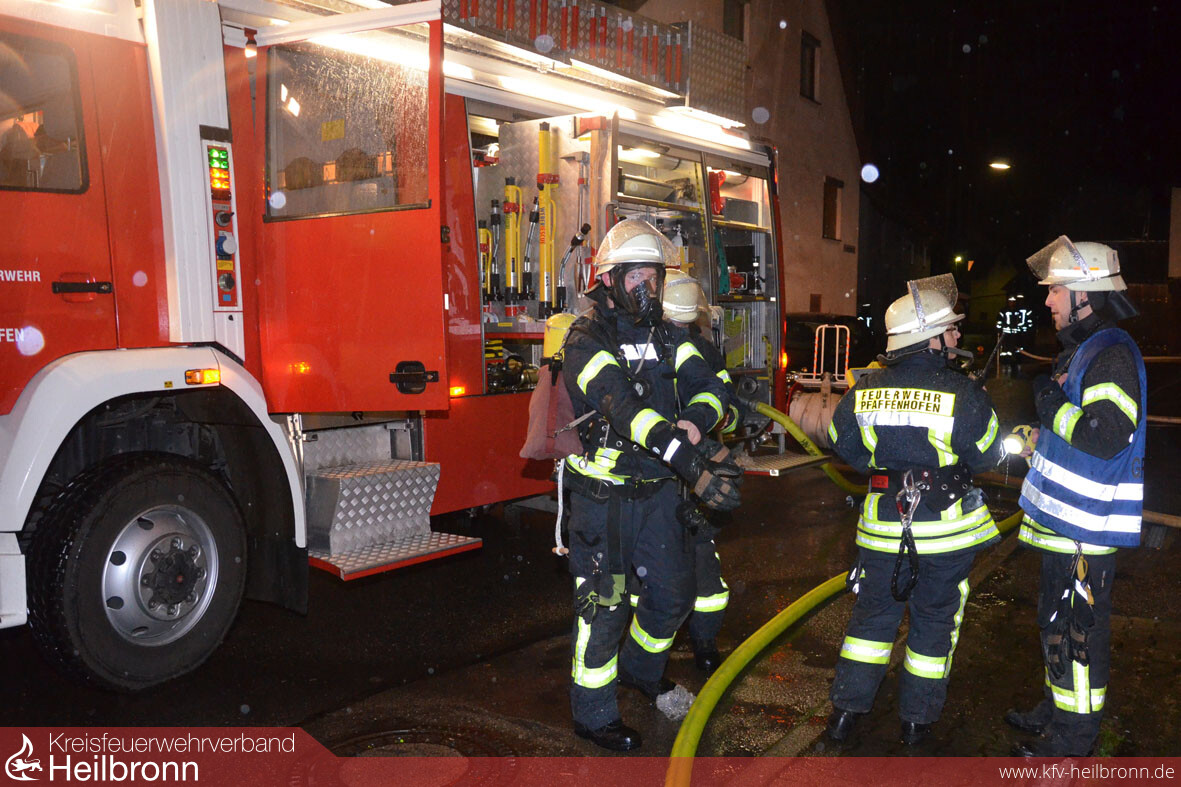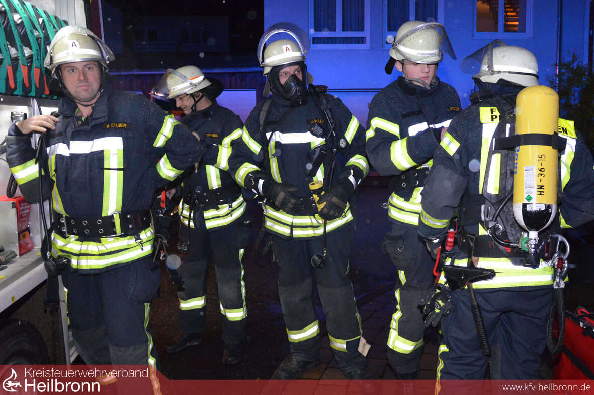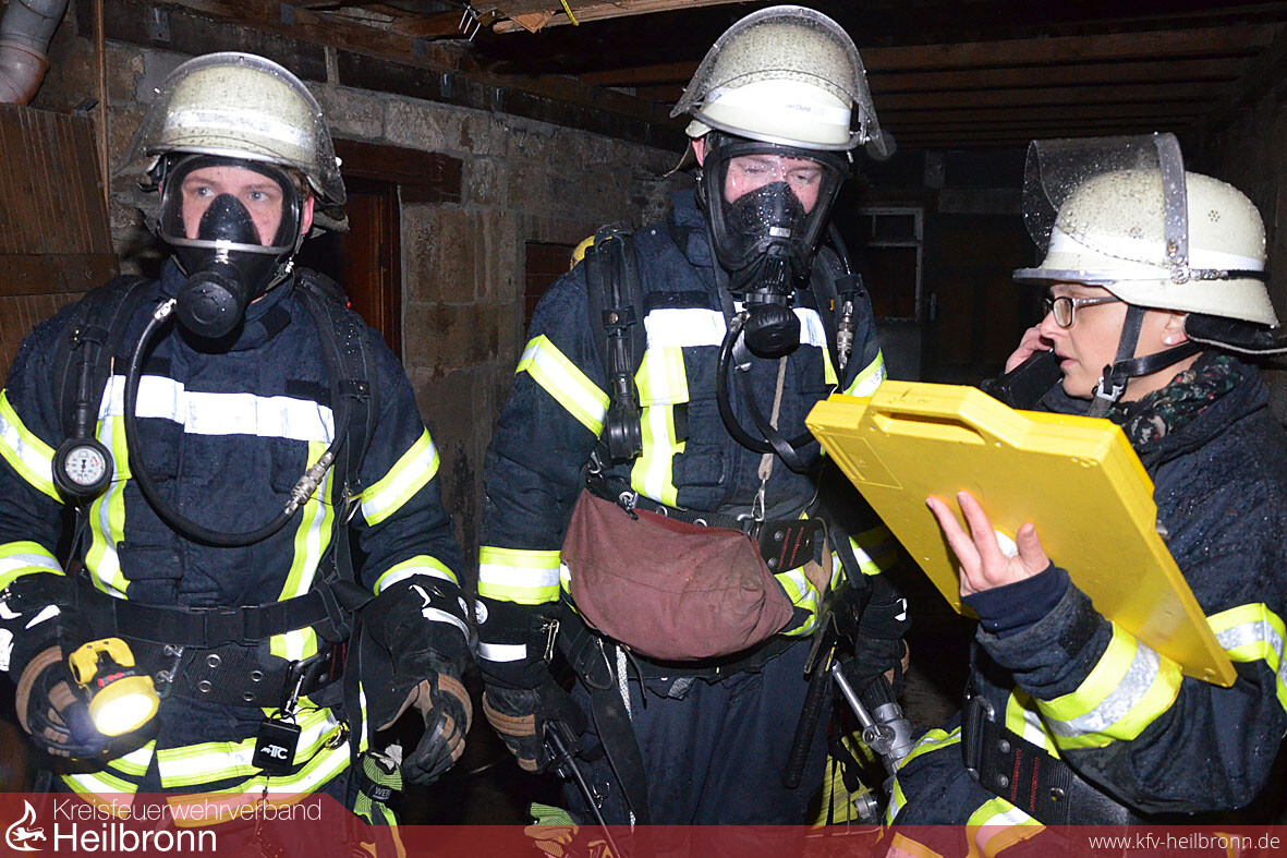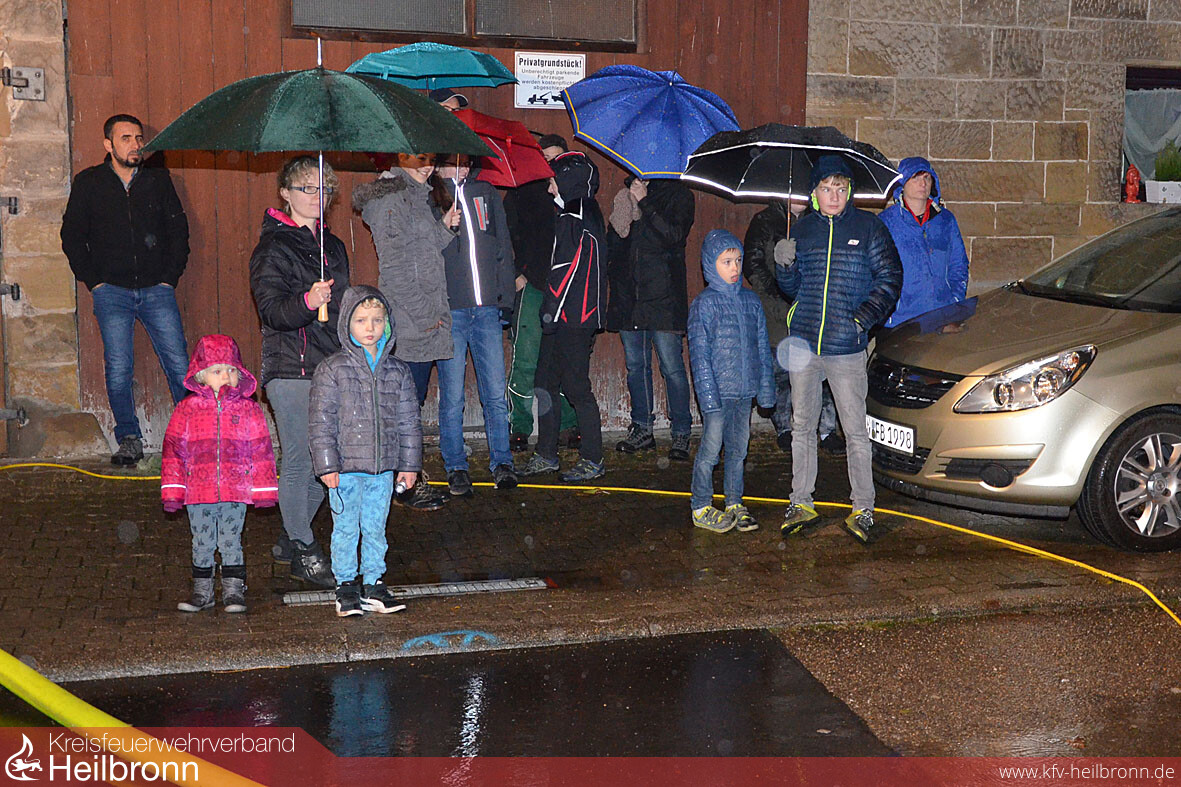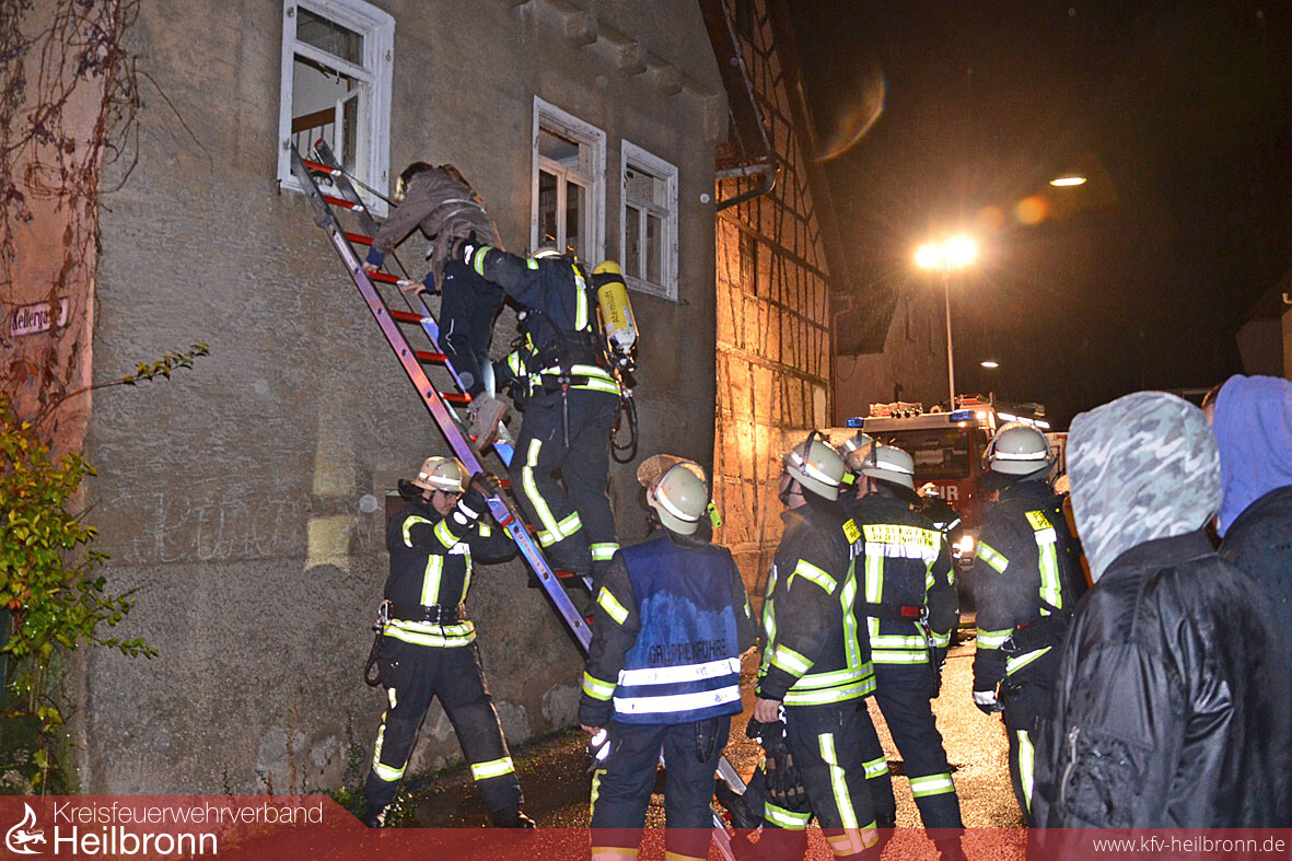 Trotz Löschwasser von oben werden auf beiden Seiten des Objekts Standrohre gesetzt, Schläuche ausgerollt und Löschtrupps zur Brandbekämpfung bereitgestellt. Die ausgefahrenen Lichtmasten an den Löschfahrzeugen beleuchten die Szene, und die Angrifftrupps rüsteten sich zur Suche nach den Vermissten mit Atemschutzgeräten aus. Tragen werden hergerichtet und Anlegeleitern in Stellung gebracht. Zwei Personen können nur durchs Fenster über die Leiter geborgen werden, haben die Gruppenführer vor Ort schnell erkannt. Ein größeres Problem, bei den schmalen kleinen Fenstern der alten Häuser, wie sich bald herausstellt. „Eine wirklich bewusstlose Person hätten wir - ohne dass man das Fenster raus schlägt und die Öffnung größer macht - gar nicht herausgebracht“, stellt Gerhard Volland hinterher fest. Im Ernstfall wären wir da ja auch nicht alleine, erklärt Kommandant Fried bei der Manöverkritik. „Die Güglinger Feuerwehr und die Drehleiterbesatzung aus Brackenheim werden in so einem Fall nach der aktuellen Ausrückeordnung mitalarmiert“.