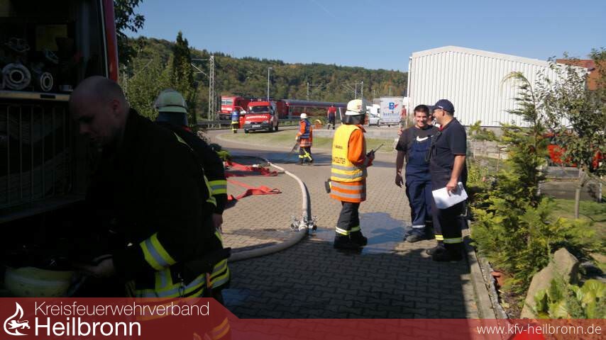 Die ersteintreffenden Kameraden aus Herbolzheim begangen sofort mit der Menschenrettung. Im Firmengebäude waren zwei Personen vermisst. Unterstützt wurde sie dabei von den Kameraden des kurz darauf eintreffenden Tanklöschfahrzeugs (TLF 16/25) aus Neudenau. Gleichzeitig mit dem TLF war auch der Einsatzleitwagen (ELW1) eingetroffen. Beide Fahrzeuge waren durch geschlossene Bahnschranken in Neudenau aufgehalten worden. Der ELW übernahm vor Ort die Leitung und Koordinierung des Übungseinsatzes, was eine Hilfe und Erleichterung für den Einsatzleiter darstellt.
