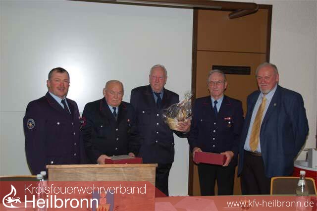 Im Bild 2 sind bei der Geschenküberreichung von links, neben dem Kommandanten Martin Stähle, die Jubilare Ernst Böhm, der Ehrenkommandant Gerhard Vogel, Fritz Kühner, sowie der Bürgermeister der Gemeinde Flein, Herr Schmid zu sehen.
