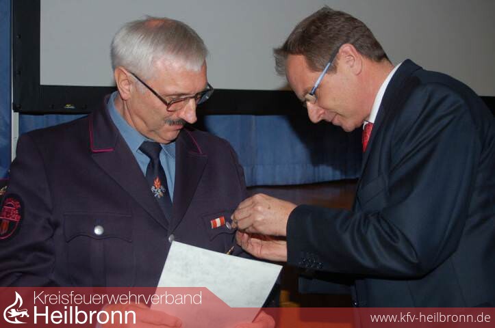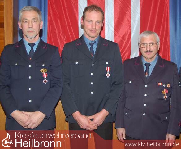 Bild 1: KFV-Vorsitzender Reinhold Gall heftet Gerhard Stuber das Ehrenzeichen des KFV an die Uniformjacke.Bild 2: Mit dem Feuerwehr-Ehrenzeichen in Silber für 25 Dienstjahre wurden Werner Sick und Martin Böckle ausgezeichnet. Gerhard Stuber (rechts) mit dem goldenen Ehrenzeichen für 40 Feuerwehrjahre.Bild 3: Sie wurden befördert.Bild 4: Mit Handschlag heißt Kommandant Matthias Fried den neuen Feuerwehranwärter Fabian WöhrBild 5: Neu- und Wiedergewählt: Kommandant Matthias Fried und seine Stellvertreter Matthias Koch und Markus Beitler. (Werner Stuber)