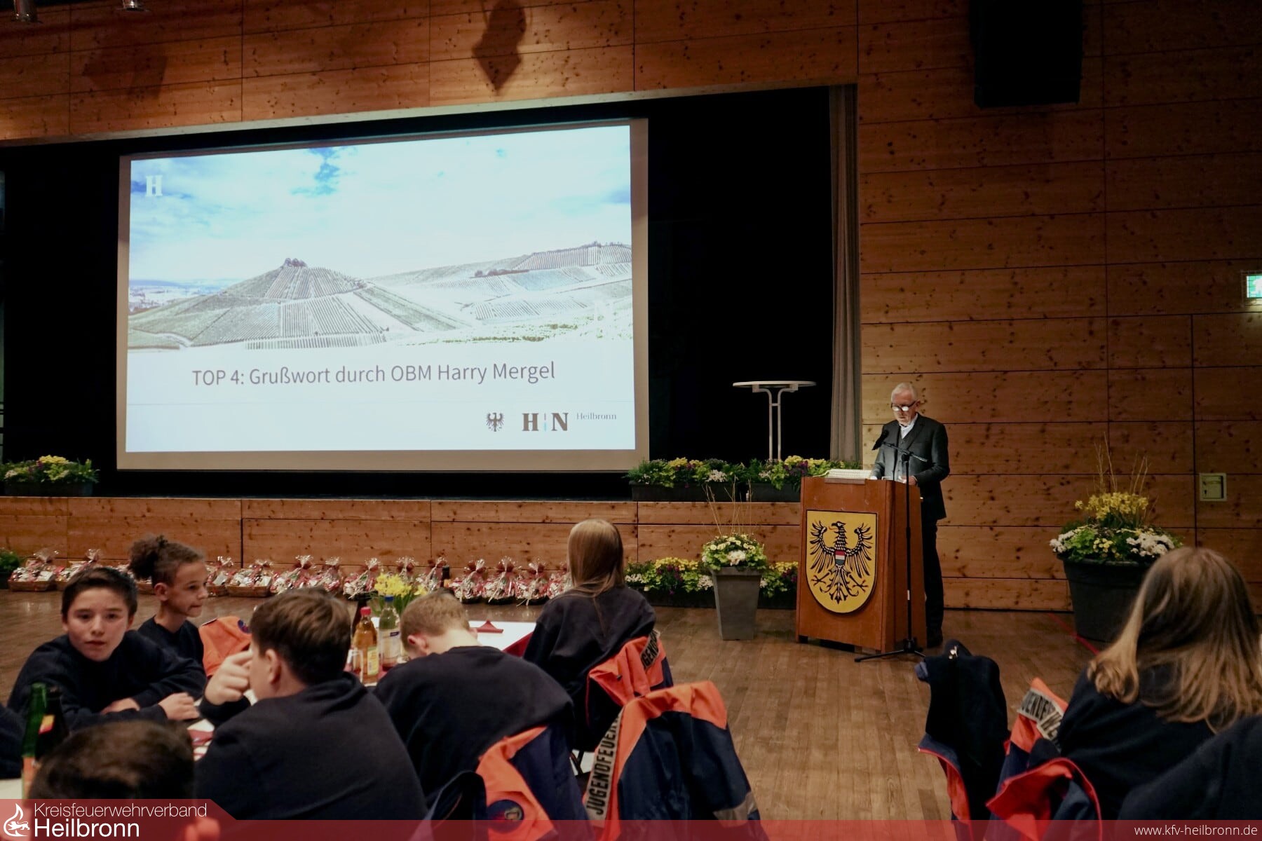 Pünktlich um 19 Uhr eröffnete Feuerwehrkommandant Fabian Müller am Freitag, 14. März 2025 die diesjährige Hauptversammlung der Feuerwehr Heilbronn in der Neckarhalle in Heilbronn-Neckargartach. In seiner Ansprache wies er auf die aktuellen Herausforderungen der Regierung hin, welcher 70% der Bevölkerung laut Forsa-Umfrage jedoch immer weniger vertrauen. Er richtete seinen Fokus aber auch auf funktionierende Dinge wie die Feuerwehren, welche gut funktionieren und ebenfalls den Staat verkörpern.