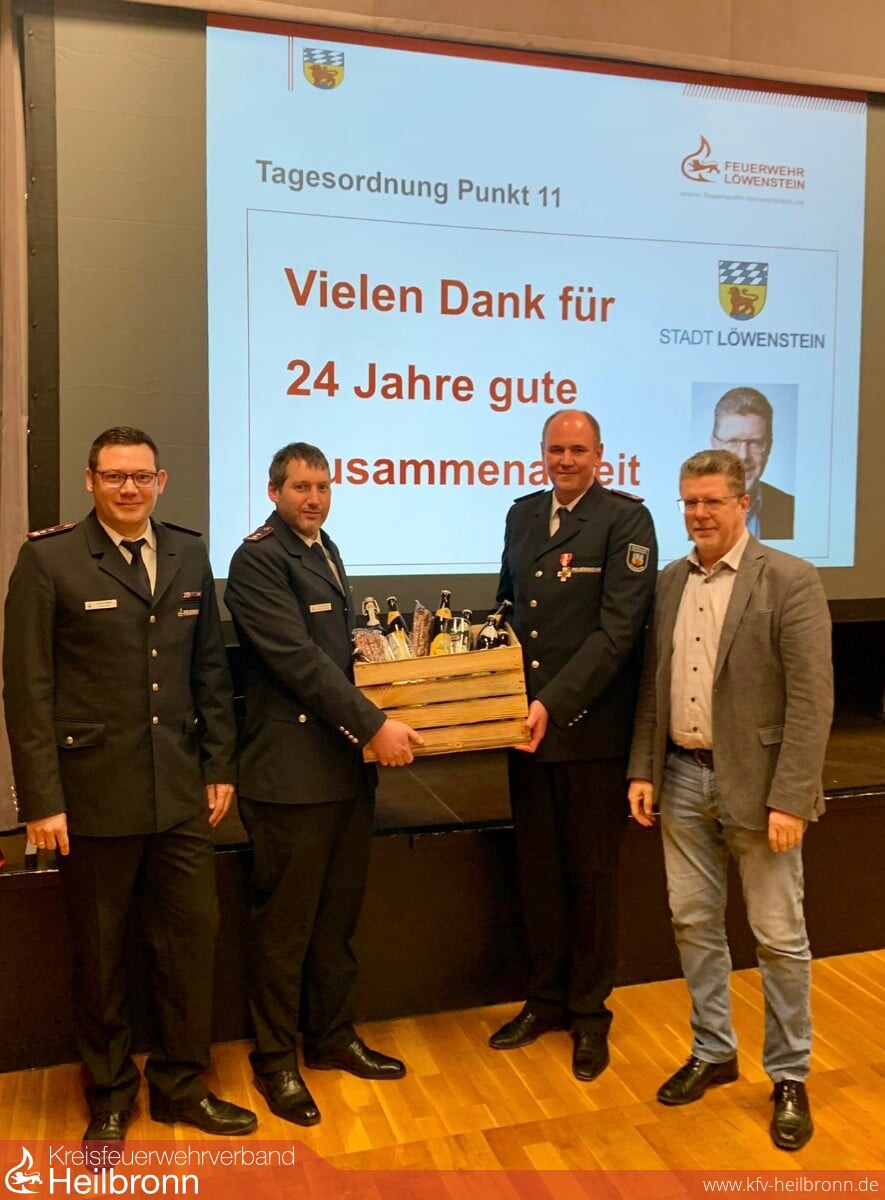 Bürgermeister Klaus Schifferer bedankte sich bei seiner letzten Hauptversammlung bei den anwesenden Mitgliedern der Feuerwehr für Ihre ehrenamtliche Arbeit und die erfolgreiche Jugendarbeit zum Wohle der Löwensteiner Bevölkerung. Er bekräftigte die Wichtigkeit einer funktionierenden Wehr in unserer Gemeinde auch in der Zukunft. Nach 24 Jahren als oberster Feuerwehrmann der Stadt Löwenstein endet seine Amtszeit im April, rückblickend sprach er von einer guten, konstruktiven und zielgerichteten Zusammenarbeit. Kommandant Markus Wagner ließ noch einmal die wichtigsten Ereignisse der 24-jährigen Zusammenarbeit Revue passieren und verabschiedete Klaus Schifferer mit einem Geschenkkorb.