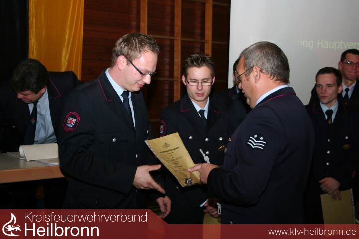 Bei der Hauptversammlung der Freiw. Feuerwehr Oedheim konnte Kommandant Franz Schuster die jungen Feuerwehrkameraden Thomas Feeser, Julian Knecht und Sascha Rauhut per Handschlag für den Dienst in der Einsatzabteilung verpflichten. Erfreulicherweise konnte er zahlreiche Beförderungen vornehmen. Florian Burkart, Stephen Funk und Patrick Fiedler wurden zum Feuerwehrmann ernannt, Markus Denzer, Marcel Ester, Jonas Hofmann, Fabian Last und Matthias Kirner zum Oberfeuerwehrmann befördert. Hauptfeuerwehrmann sind künftig Stefan Mosthaf und Axel Zimmermann. Aufgrund des erfolgreichen Abschlusses des Gruppenführerlehrgangs in Bruchsal können Alexandra Haag und Tobias Keicher zum Löschmeister ernannt werden. Daniel Enderer und Sven Kübler sind aufgrund des erfolgreichen Besuchs des Zugführerlehrgangs sowie ihrer Führungspositionen künftig sogar Brandmeister.