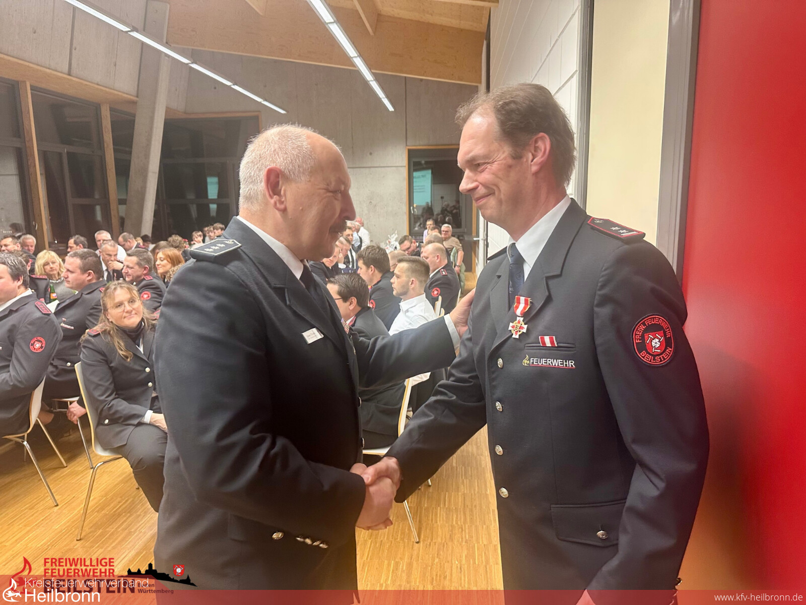 Der stellvertretende Kreisbrandmeister Uwe Thoma begrüßte die Versammlung gut gelaunt und lobte die Schlagkraft und Einsatzbereitschaft der Beilsteiner Wehr. In Zeiten globaler und lokaler Herausforderungen sieht er die Feuerwehren im Landkreis vielseitig gut aufgestellt und spricht ihnen eine zentrale Rolle zum Schutz der Bevölkerung im Katastrophenschutz zu – auch dank der wachsenden interkommunalen Zusammenarbeit und der engagierten jungen Generation. Der Landkreis unterstützt dies durch gemeinsam nutzbare Einsatzmittel und Fahrzeuge, die Entwicklung von Führungsstäben und eine intensive Weiterentwicklung der Aus- und Fortbildung. Als Ausblick erwähnte er die mögliche Erweiterung des Einzugsbereichs der integrierten Leitstelle. Mit einem Schmunzeln schloss er seine Rede: „Was kann es Schöneres geben, als in dem schönen Beilstein zu leben?“