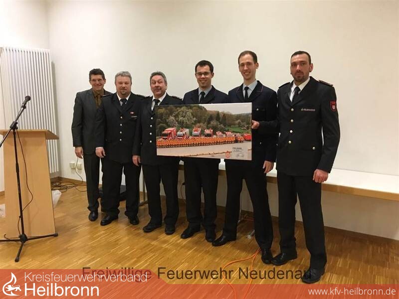 Das 150jährige Jubiläum der Neudenau Wehr war für alle Redner am Abend der Hauptversammlung eine Erwähnung wert. Mit unzähligen Veranstaltungen zeigten die Floriansjünger im vergangenen Jahr, dass sie nicht nur bei Bränden und Unfällen helfen können. Zum Dank für die Unterstützung aus allen Abteilungen überreichte der Neudenauer Abteilungskommandant Sven Reinhardt den Abteilungen ein Gruppenbild der Feuerwehr auf Leinwand gedruckt.