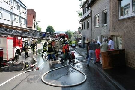 Der Nachbar hat das Feuer etwa zeitgleich mit dem 16-jährigen Jungen bemerkt, der sich im Haus aufhielt. Er habe den Hund bellen gehört. Dann sei er in den Garten und habe gesehen, wie eine Stichflamme aus einem Fenster schoss. Die Scheibe platzte. Der Nachbar wählte sofort die 112, aber der Feuerwehrmann in der Leitstelle wusste schon Bescheid. Neben der Bad Wimpfener Feuerwehr (30 Mann mit vier Fahrzeugen) kam auch die Werksfeuerwehr von Solvay (zwei Fahrzeuge) gleich zum Einsatzort.
