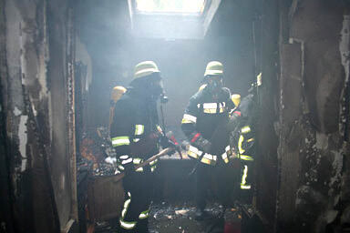 Qualm überall, es ist stickig und heiß. Türen, Wände, Einrichtung - alles schwarz. Viele Gegenstände sind verkohlt, andere geschmolzen. Die Feuerwehrmänner rennen mit Atemschutzmasken durchs Haus und suchen mit der Wärmebildkamera nach letzten Glutresten.