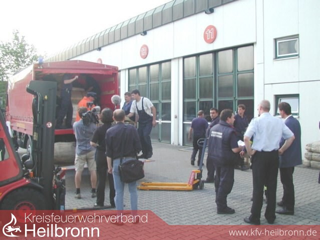 Gegen 19.00 Uhr traf ein LKW der Feuerwehr Nürtingen mit 30 000 Sandsäcken aus dem Landkreis Eßlingen in der Hauptfeuerwache in Heilbronn ein. Zu diesem Zeitpunkt lagen dort weitere 30 000 Sandsäcke aus den Beständen der Feuerwehren des Stadt- und Landkreises zur Verladung bereit.