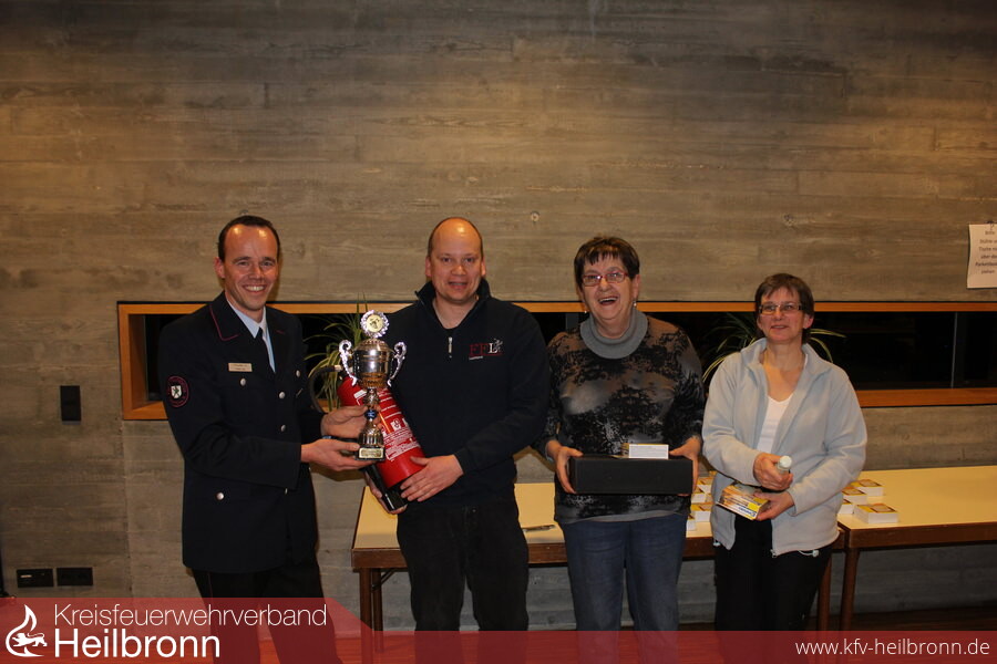 Bei der Siegerehrung bedankte sich der Stellv. Kommandant Peter Link bei allen Spielerinnen und Spielern für ein faires und spannendes Spiel und betonte, dass alle ja eigentlich Sieger sind, da ja Spiel und Spaß im Vordergrund stehen. Neben dem Wanderpokal durfte Volker Gramit auch einen Feuerlöscher als Preis entgegennehmen. Für die Plätze zwei und drei gab es ein Wein- und Sektpräsent. Das Schlusslicht durfte als Trostpreis die obligatorische Schwarzwurst in Empfang nehmen. Im Hinblick auf die Rauchmelderpflicht in Baden-Württemberg, erhielten alle Teilnehmerinnen und Teilnehmer einen Rauchmelder, der zur künftigen Sicherheit beitragen soll.