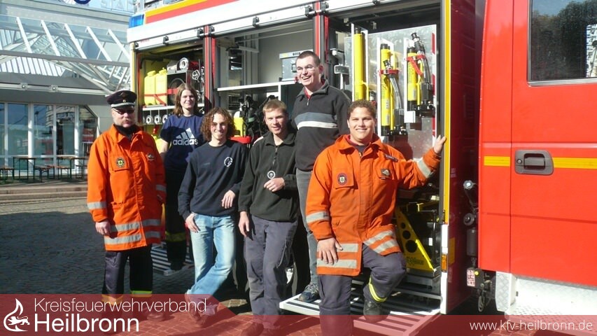 Bild 1: Vor dem Eingang zum ÜbungscontainerBild 2: StrahlrohrtrainingBild 3: Kommandant Karl Wehler, Jessica Karger*, Torsten Wehler*, Friedrich Kurz*, Marcel Karger* und Daniel Ziegler vor dem zu einer Fahrzeugausstellung mitgereisten LF 10/6 (*=Trainingsteilnehmer)