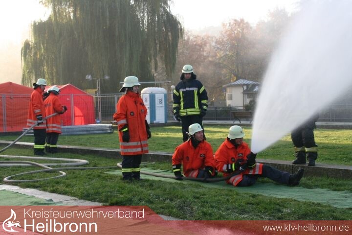 Nach der Einweisung ging es gleich mit einem Strahlrohrtraining los. Erst einmal das „High-Tech-Teil" anschauen und ausprobieren. Dann die Praxis mit Einsatzbeispielen. Richtig interessant und viele nützliche Tipps von den Trainern - schon hier hat man viel über die erst seit vier Wochen in Nordheim vorhandenen Hohlstrahlrohre gelernt.