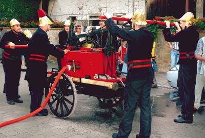 Alles im Fluss Zum Abschluss gab es Abkühlung im doppelten Sinne. Vor dem verdienten Bier im Feuerwehrhaus stand Wasserschleppen an: Mit einer Löschspritze und in historischen Uniformen demonstrierte die Freiwillige Feuerwehr Eppingen, wie man anno dazumal den Flammen zu Leibe rückte - nämlich mit tatkräftiger Hilfe aller Bürger. „Wir können zwar die Ängste nicht nachvollziehen, die ein Feuer damals auslöste - aber wie es zuging, schon“, ermunterte Reinhard Ihle die Besucher zum Mitmachen. Auch wenn die Wassereimer-Kette anfangs etwas schleppend in Gang kam, hieß es zum glücklichen Ende doch: „Wasser marsch!“