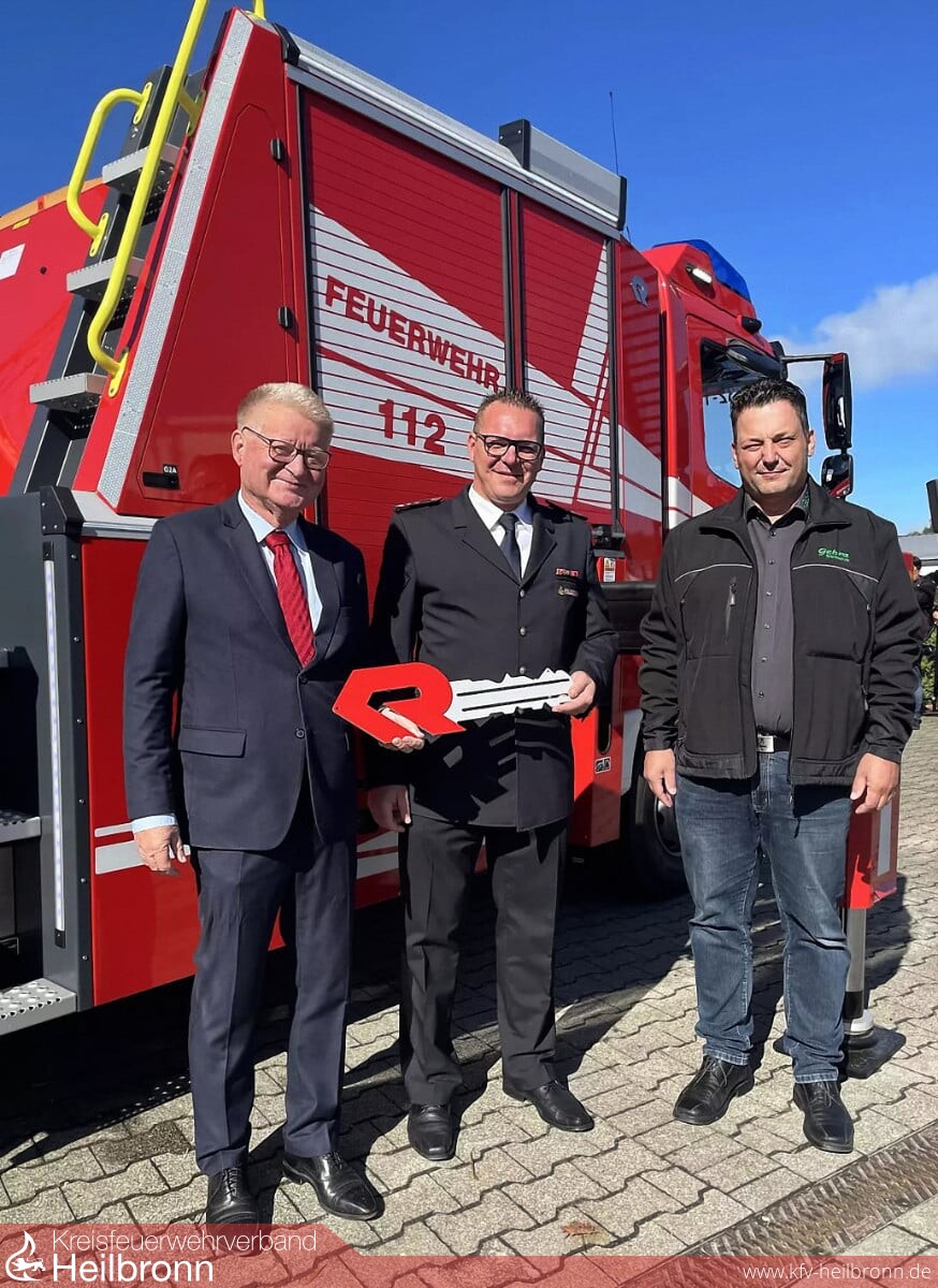 Als seine letzte Amtshandlung übergab Ulrich Stammer den symbolischen Schlüssel für das Fahrzeug an den Kommandanten. „Wir übergeben heute das teuerste Fahrzeug, das die Stadt jemals angeschafft hat. Ich bin mir sicher, dass es in guten Händen ist und bin froh, dass die Kameradinnen und Kameraden damit auf dem neuesten Stand ausgerüstet sind. Ich wünsche Ihnen immer gesundes Heimkommen von den Einsätzen“.