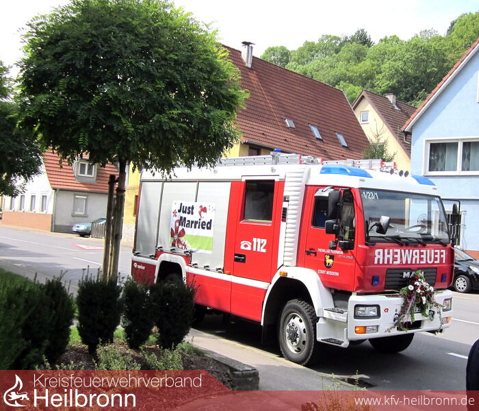 Als besondere Überraschung stand das schön geschmückete TLF 16/25 als „Hochzeitskutsche“ vor der Kirche, das die Beiden dann nach Korb chauffierte, wo die Hochzeitsfeier stattfand.
