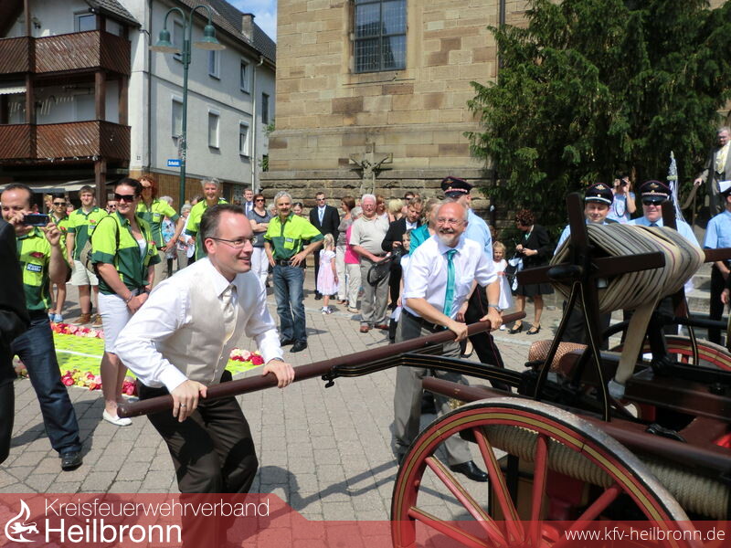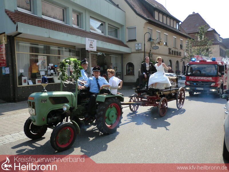 Eine große Zahl von Feuerwehrleuten ließ es sich am vergangenen Samstag nicht nehmen, unterhalb der kath. Kirche Spalier zu stehen und das junge Ehepaar vor eine größere Aufgabe zu stellen. Höhepunkt war dann aber die Fahrt mit dem Hydrophor von 1880, gezogen vom noch nicht ganz so alten Holder mit 12 PS von Bernd Ehrhardt, von der Kirche bis zur Kochana. Wir hoffen nun, dass wir dazu beigetragen haben, dass die Hochzeitsfeier der beiden nicht so schnell vergessen wird.