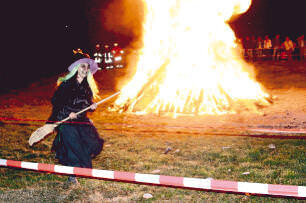Die Feuerwehrleute warten, bis sich alle Fackelträger und ihre Begleiter um das Feuer versammelt haben. Dann entzündet Markus Frech mit einer langen Holzstange das Walpurgisfeuer. Knisternd züngeln die Flammen, und die Kinder werfen die Reste ihrer brennenden Fackeln ins Feuer. Eine Hexe rennt unter dem Beifall der Zuschauer mit ihrem Besen zweimal um das lodernde Feuer.