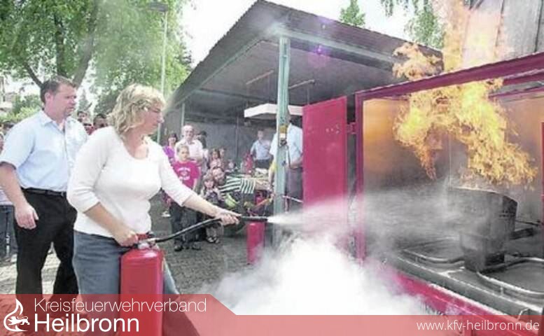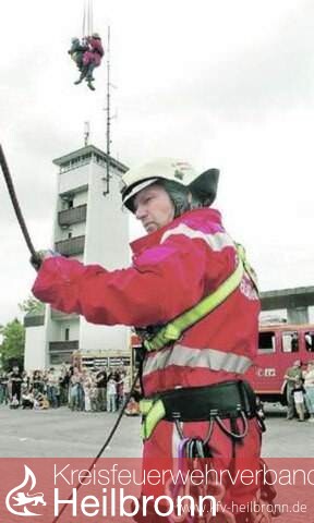 Da baumelt jemand in zwanzig Meter Höhe. Den Sicherungsgurt um die Hüfte, Kopf nach unten. Das sieht nicht gut aus: Doch die Zuschauer wissen - alles ist nur Show. Die Feuerwehr zeigt beim Tag der offenen Tür, wie sie Menschen in luftigen Höhen rettet. Alltag für die 68 Männer von der Heilbronner Berufsfeuerwehr. Nur für das Publikum wird der Ernst zum Anschauungsobjekt. Da drückt ein Feuerwehrmann eine Branddecke auf einen Fettbrand. Interessierte dürfen selbst ein Gasfeuer löschen. So richtig traut sich keiner. "Sie sollten vor einem Ernstfall ein Gefühl für das Feuerlöschgerät bekommen",lockt der Feuerwehrmann die Tester.