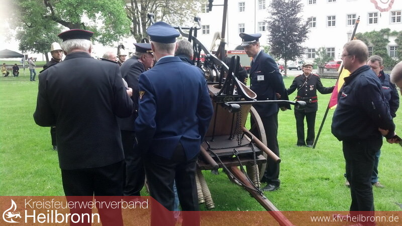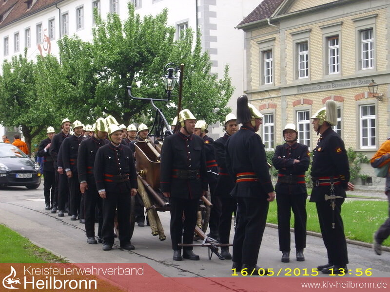 Nach wochenlangen Vorbereitungen und vier mitunter anstrengenden Übungsabenden war die Vorfreude auf den 25. Handdruckspritzenwettbewerb des Landesfeuerwehrverbandes Baden-Württemberg bei den 23 Teilnehmern der historischen Abteilung der Freiwilligen Feuerwehr Eppingen riesengroß: nachdem der Gerätewagen-Transport mit den historischen Uniformen und der historischen Spritze aus dem Jahre 1847 beladen war, ging es mit dem GW-T und drei Kleinbussen endlich Richtung Bodensee. Anlässlich des 150-jährigen Jubiläums der Freiwilligen Feuerwehr Salem fand dort am Samstag, 16. Mai 2015, der 25. Handdruckspritzenwettbewerb in der malerischen Kulisse von Schloss Salem statt.