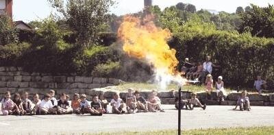 Bild: Heißes Experiment: Die Freiwillige Feuerwehr zeigt den Grundschülern, wie gefährlich eine Fettexplosion sein kann. (Foto: Steffen Heizereder)